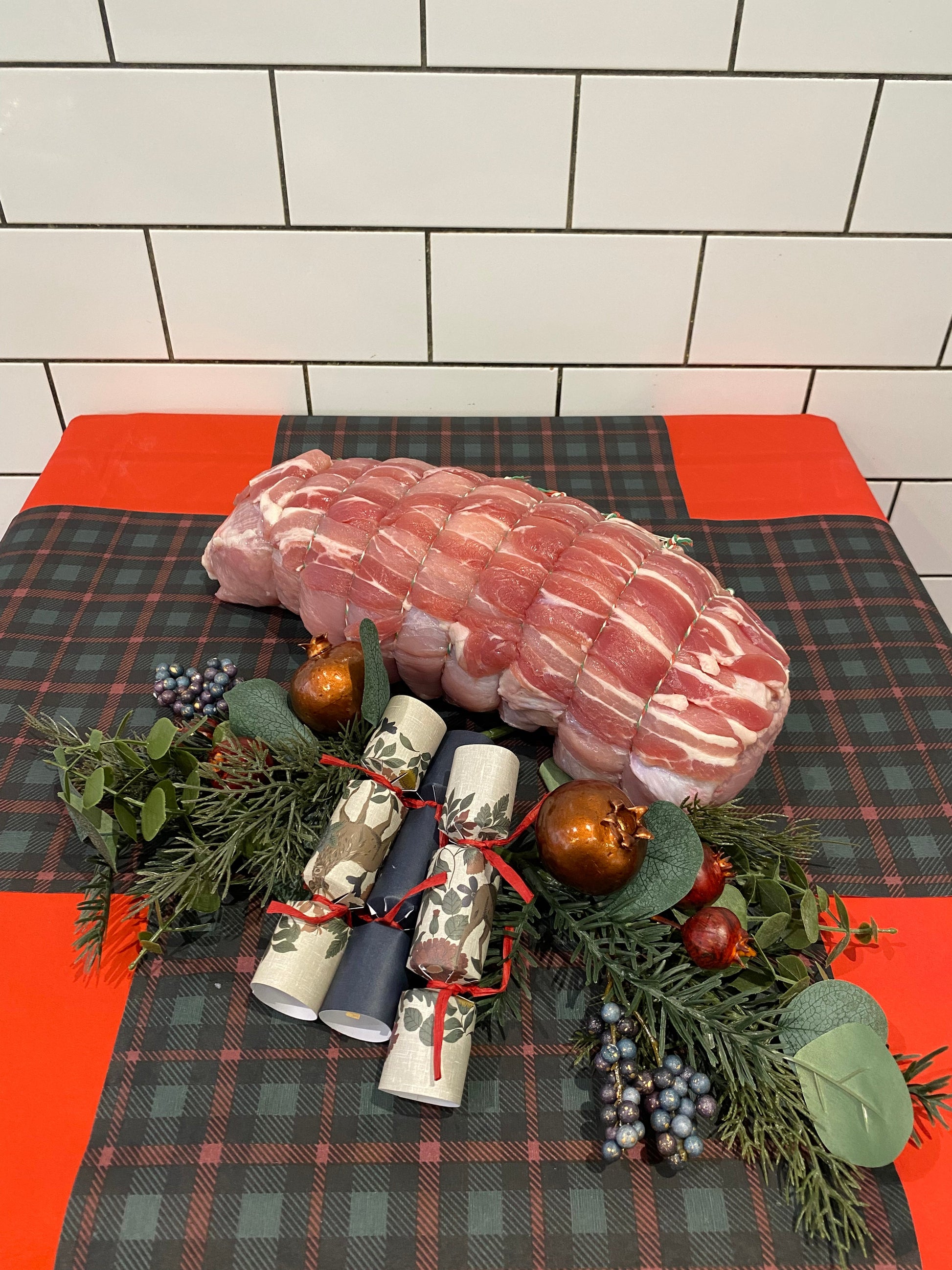 Free Range Goodman’s Rolled Boneless Turkey Breast (Crown) wrapped in Dry Cured Streaky Bacon